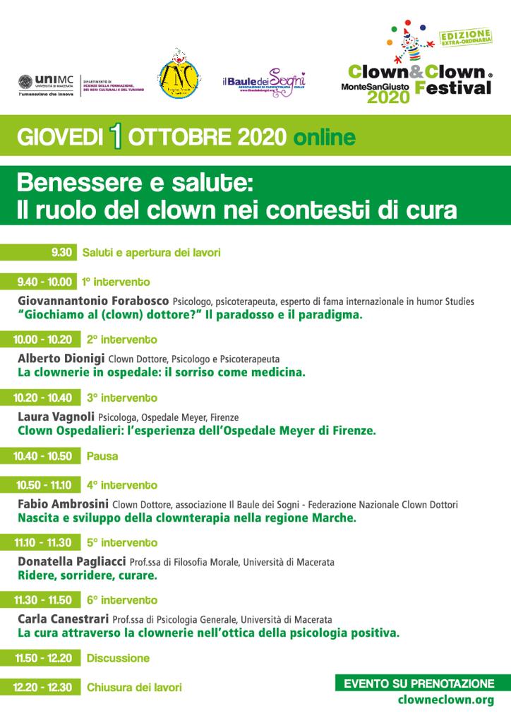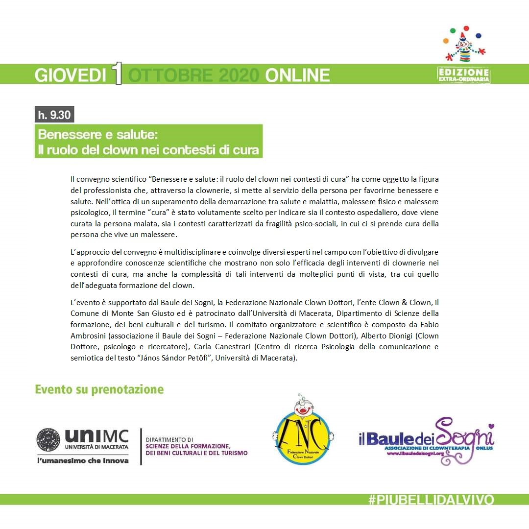 sono lieta di comunicarle che il primo ottobre 2020, dalle 9.30 alle 12.30 si svolgerà il convegno scientifico dal titolo “Benessere e salute: il ruolo del clown nei contesti di cura” (in sostituzione dell’omonimo seminario programmato per lo scorso marzo e sospeso a causa dell’emergenza sanitaria). Il convegno rappresenta l’evento scientifico del Clown & Clown festival, che si svolge annualmente nel comune di Monte San Giusto. A causa dell’emergenza sanitaria, al fine di garantire la partecipazione in totale sicurezza, il convegno si terrà attraverso la app zoom.